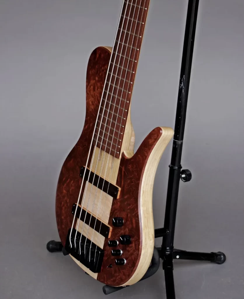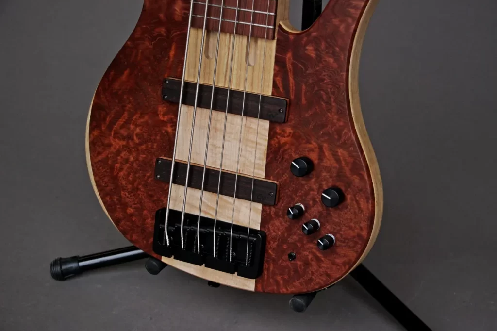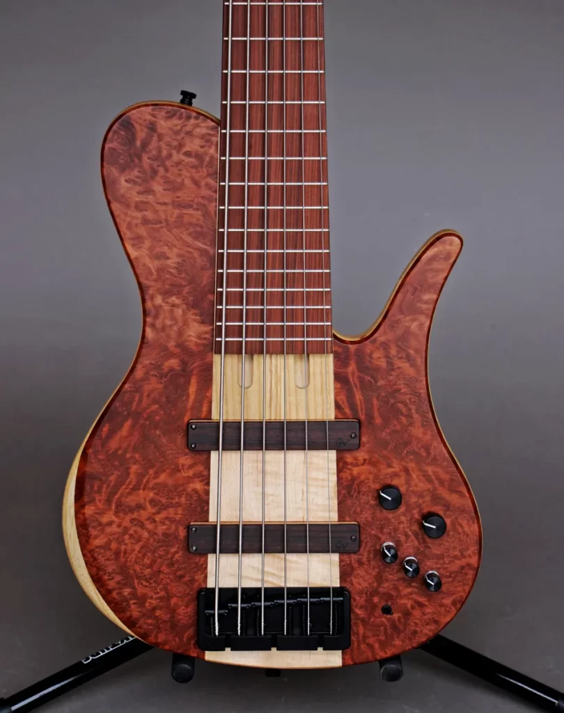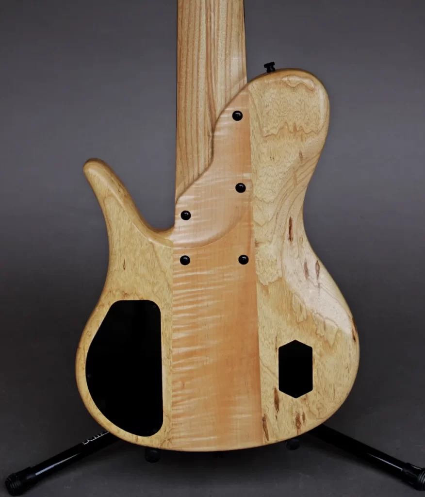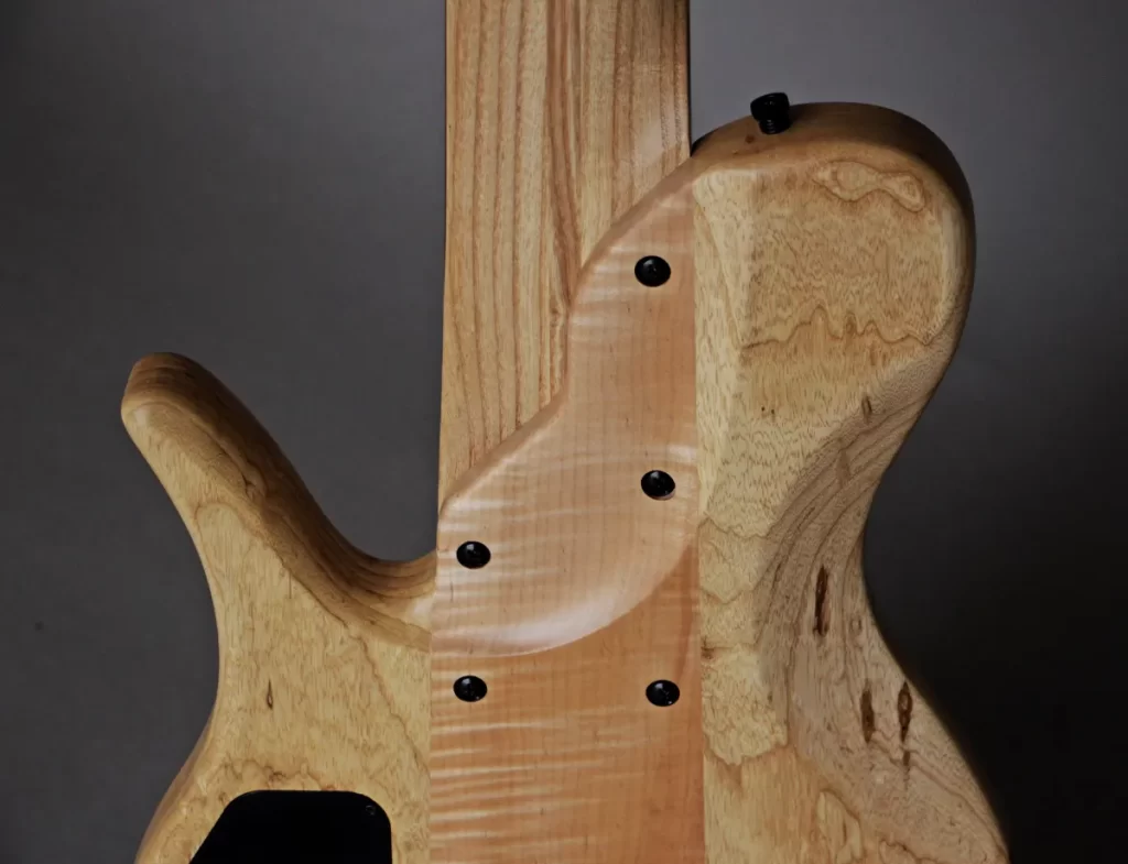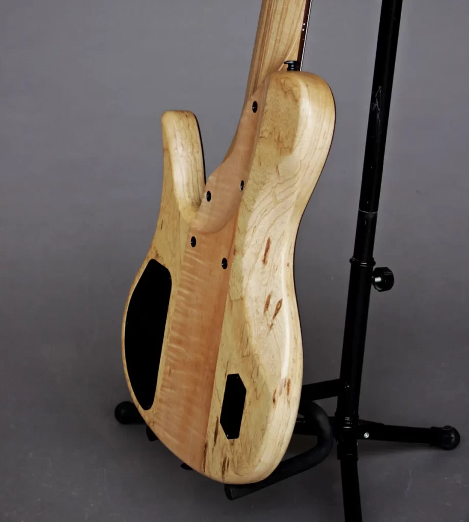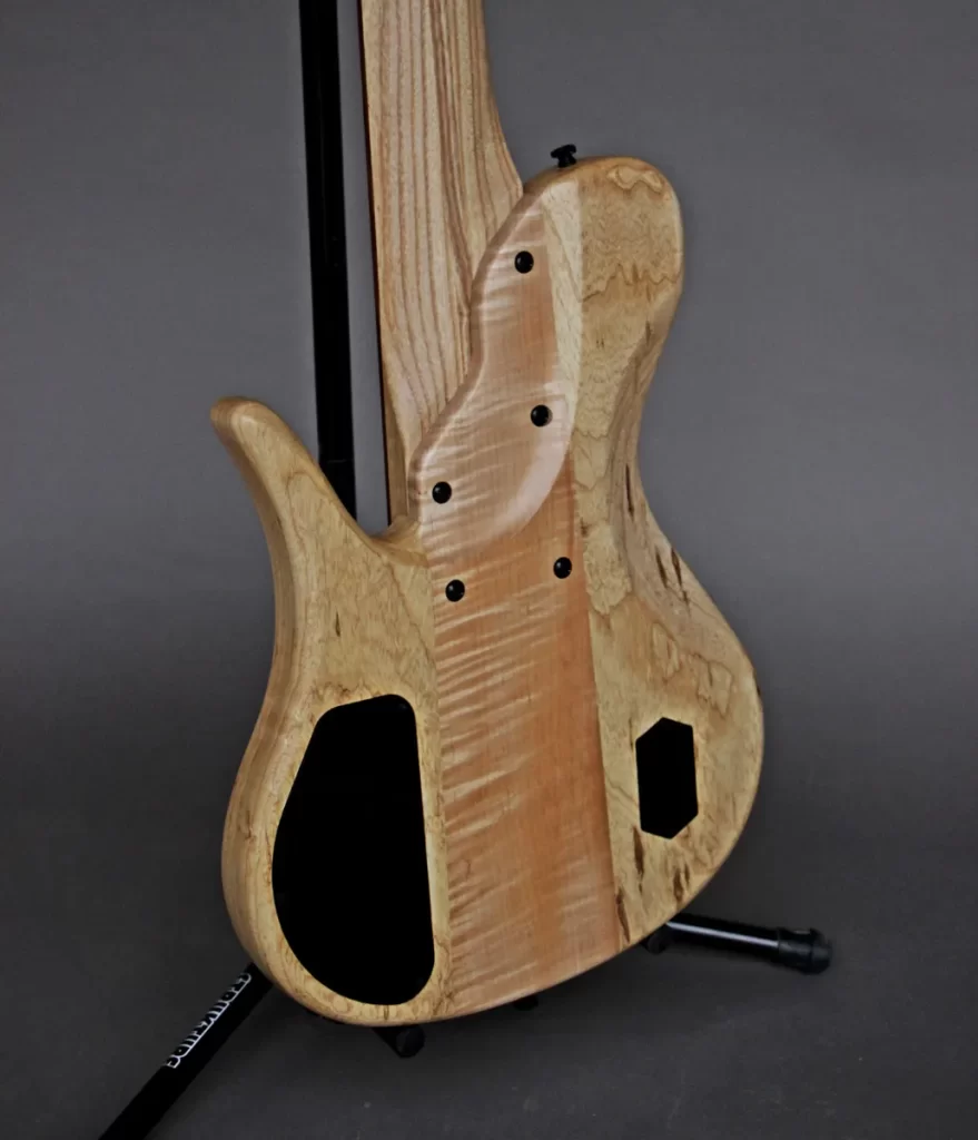 - 3 piece body with Flamed Maple center core, Swamp Ash wings and Figured Redwood top